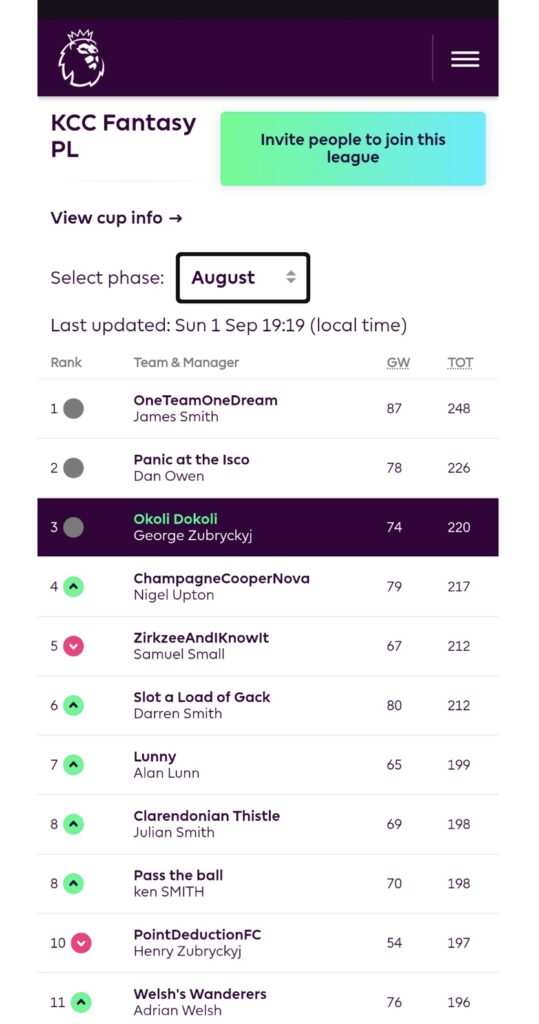Please see attached the top half of the league with “OneTeamOneDream” managed by James Smith currently leading the way. Well done James, there are a couple of pints waiting for you when you next pop in.
