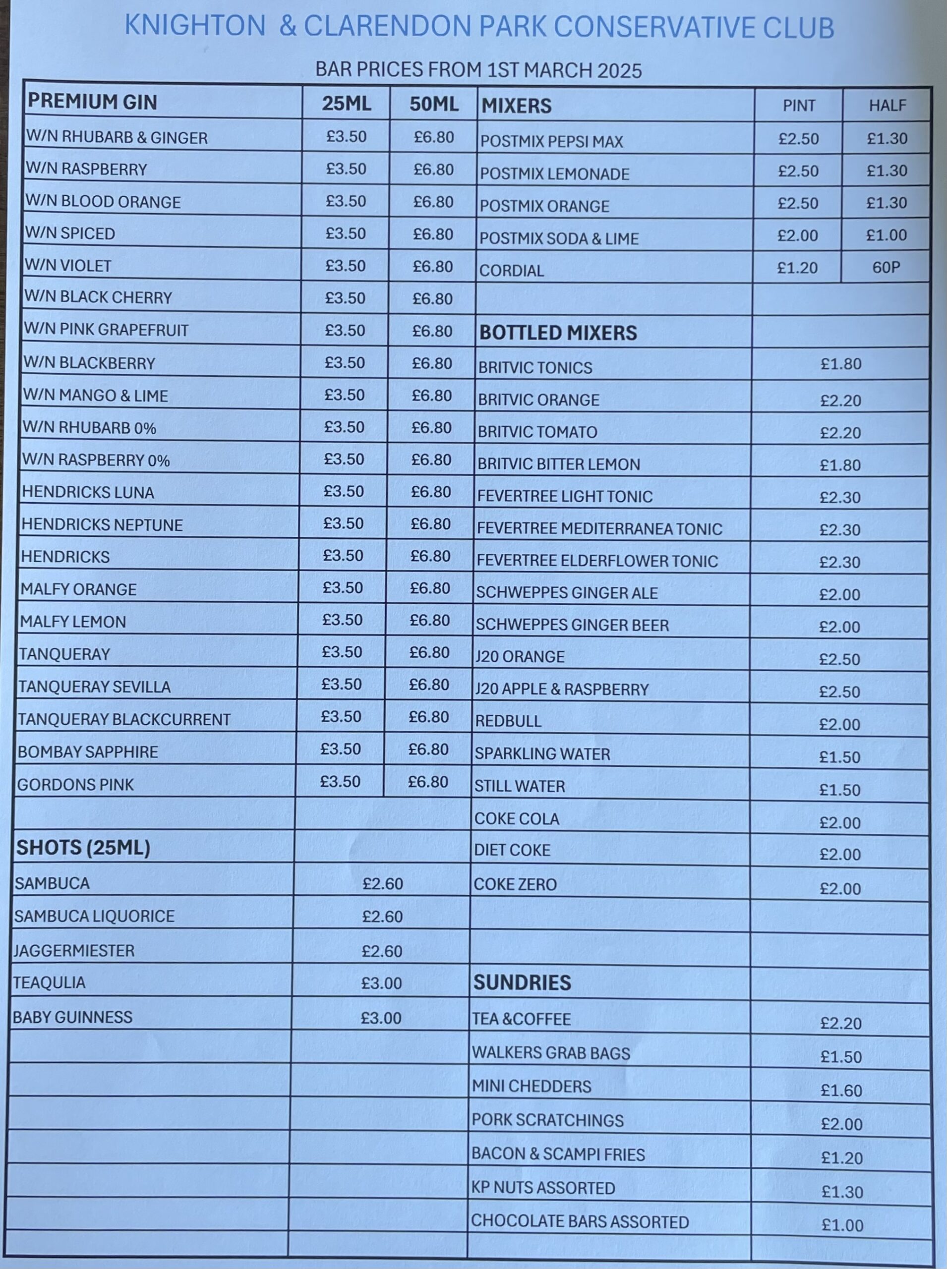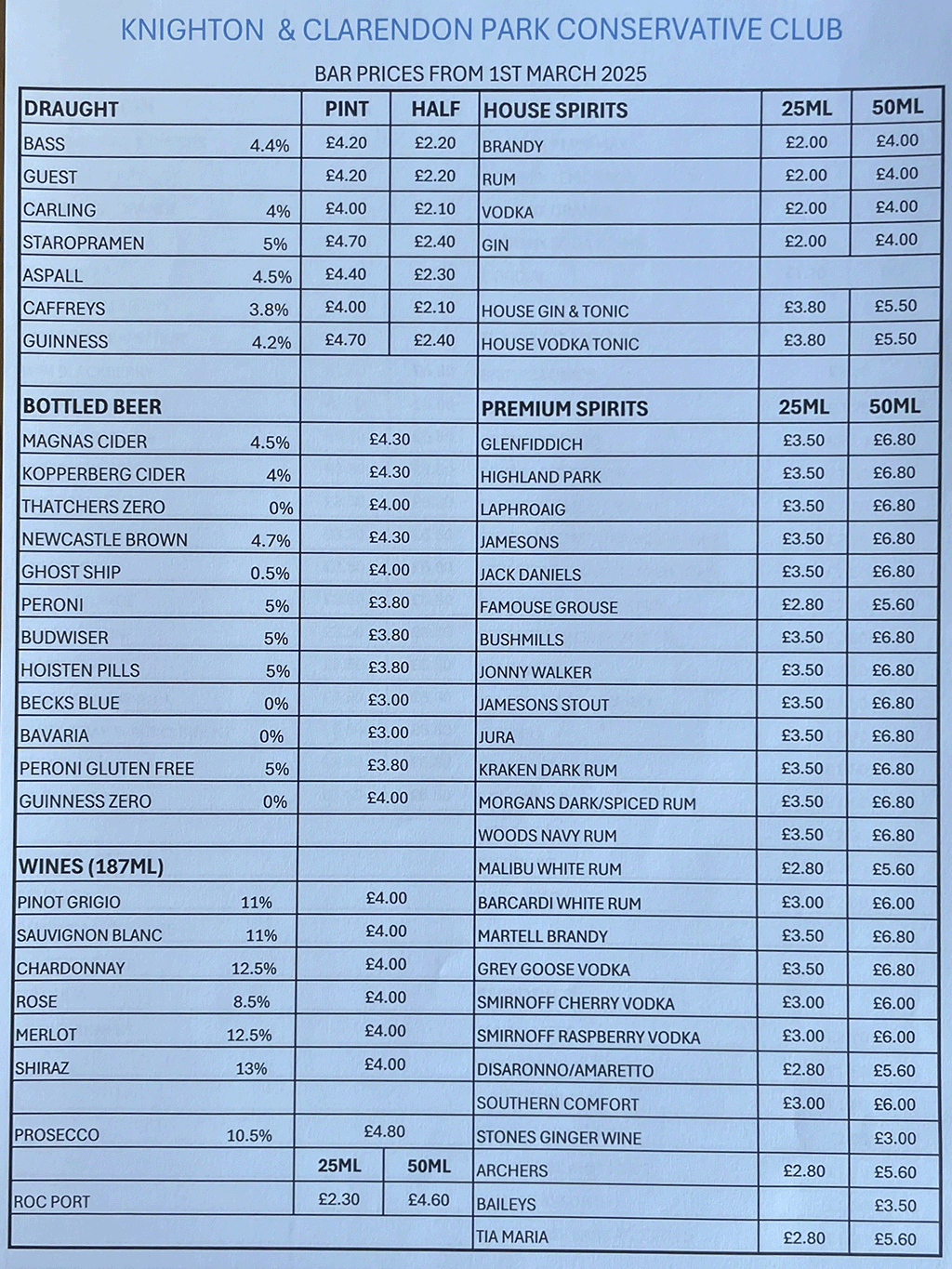 Bar Prices – Increase March 2025