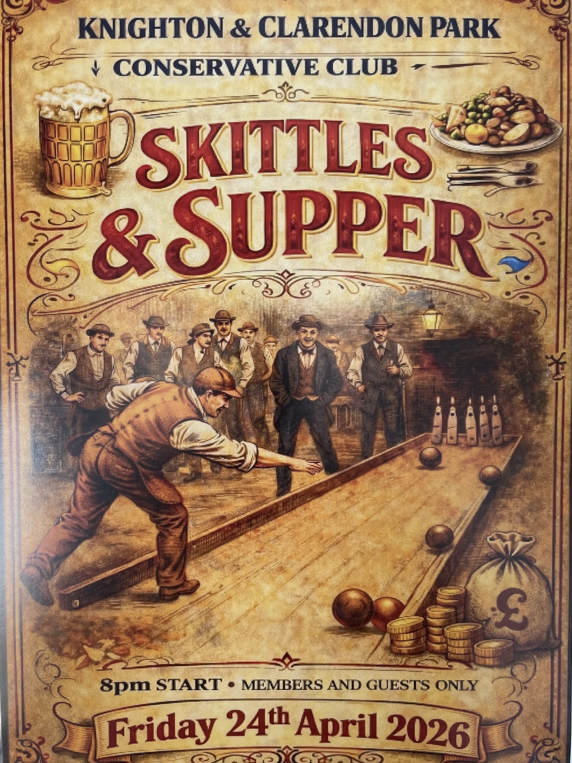 This means that Matt and Andy are elected and Karen stands down after 11 years on the committee.Matt is re-elected and is our longest serving committee member with 20 years continuous service. I would like to offer my congratulations to Andy on his election and look forward to working with him.I am sorry to see Karen leave the team; she has worked hard since 2015 and contributed to the success the club has enjoyed over the 11 years. With Jude she was instrumental in running the annual Gin nights which we used to hold in the years before COVID and more recently, again with Jude, is responsible for organising the monthly 140th Year anniversary celebrations.I would like to place on record my heartfelt thanks to Karen for all her support and efforts over the last 11 years.2) 140th Anniversary CelebrationsTalking of the 140th celebrations, the next monthly event is the “Skittles and Supper Night” on Friday 24th April, 8pm start. The complimentary supper will consist of:- Faggots